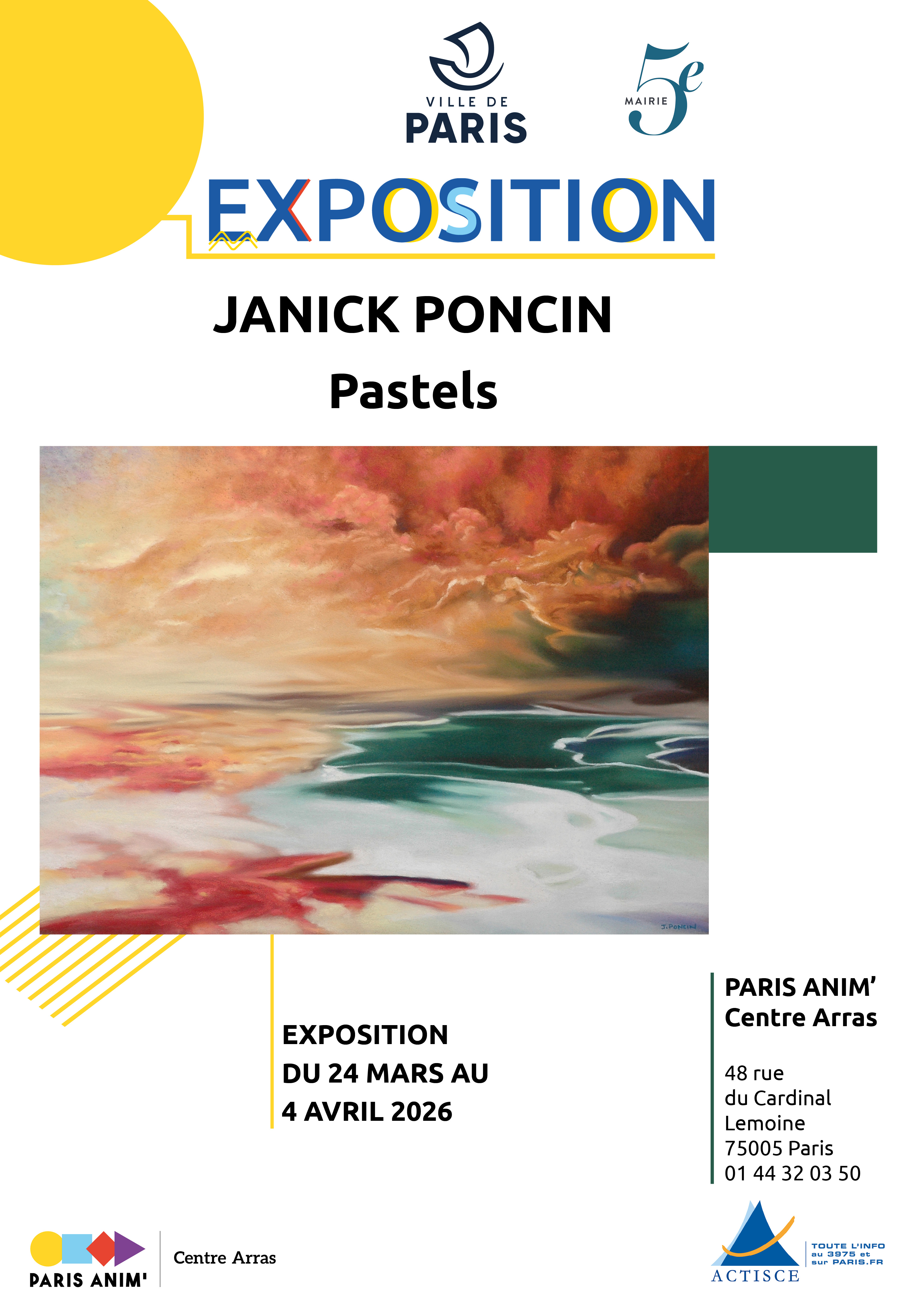J'expose 2 pastels avec mes ami(e)s du Cercle des Gobelins et mon pastel "les 4 éléments" vedette de mon expo perso en septembre Salle Capitant Mairie 5 a trouvé un acquéreur mairie 13e :-)